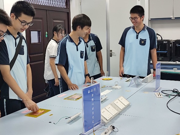 7月11日那坡中学的初中生们前来研学,在物理学院九楼的天象厅外,陈列着许多由物理学院师生参与研发的作品,志愿者向同学们详细介绍了学院参与的中国空间站上探测器项目,广西大学主导研制的X射线偏振探测器(CXPD立方星)以及蓝色能源实验室研发的摩擦发电机。同学们近距离感受到了科技之美,埋下“科研的种子”。