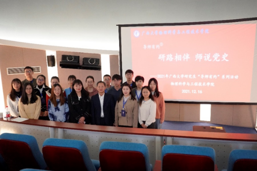 为了深入推进研究生党史学习教育和加强科研求知精神,广西大学物理科学与工程技术学院分别于2021年12月16日和12月24日在物理楼九楼天象馆举办了 “导师有约”系列活动。本次活动邀请了物理科学与工程技术学院党委书记袁涛老师和物理科学与工程技术学院院长梁恩维教授为主讲人,向物理学院研究生学子传授思想与科研方面的知识。