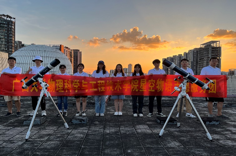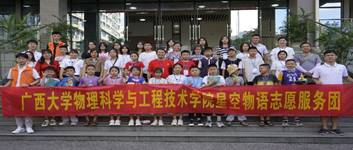 我院星空物语志愿服务团成立于2020年,在学院党委的领导下,依托学院天象馆和专业优势,一方面旨在鼓励学生拓宽视野,树立远大理想,坚定“四个自信”,把立德树人根本任务融入到社会实践中去,另一方面积极践行志愿精神,彰显青年使命担当。该志愿团队获得广西大学“优秀志愿服务项目”。