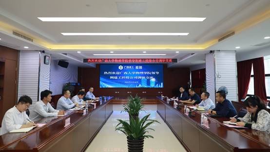 3月20日,袁涛带队赴广西建工集团控股有限公司(以下简称控股公司)调研交流,在建工大厦2号楼1813会议室,控股公司党委书记、董事长陆彪与袁涛开展座谈交流。袁涛对控股公司多年来大力支持物理学院就业工作表示感谢,并简要介绍了物理学院人才培养和队伍建设等情况,希望能为企业输送科技创新人才,为学校与企业搭建沟通交流的平台。在会上,陆彪对袁涛一行的到来表示欢迎,并简要介绍了控股公司的基本情况,同时作为广西大学校友,他希望双方加强沟通与深度交流,进一步加强校企合作。