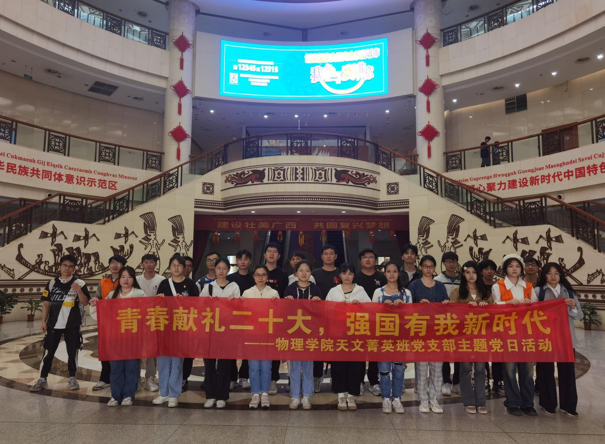 为学习贯彻党的二十大精神,筑牢民族团结奋斗的思想基础,进一步提高学生党员的使命感和责任感,更好地发挥党支部的战斗堡垒作用和党员的先锋模范作用,我院天文菁英班党支部于4月2日赴南宁市青秀山、广西民族博物馆开展“青春献礼二十大,强国有我新征程”主题党日活动。