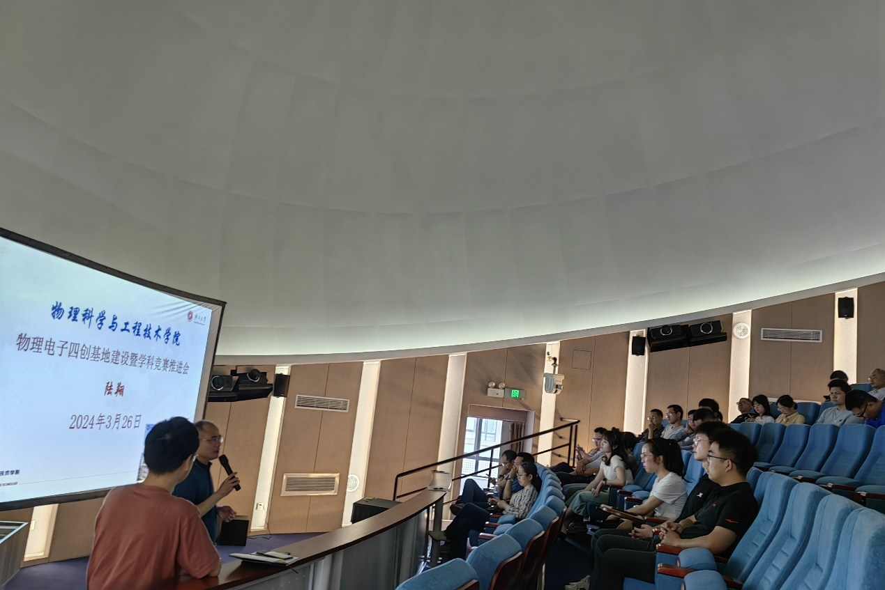 为深化学院创新创业教育教学改革,激励学院教师更多参与学科竞赛等学生四创指导工作,2024年3月26日下午,物理学院特邀请陆翔副院长对学院四创基地建设与学科竞赛进行整体汇报,林达斌副院长主持报告,学院近四十位专任教师听取了汇报。
