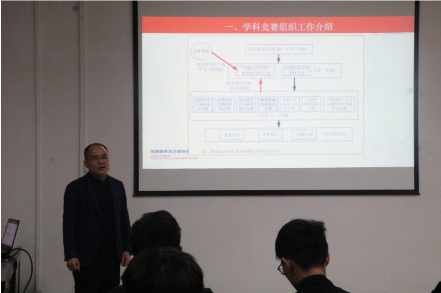 会上,陆翔副院长介绍了我院历年在参加全国大学生电子设计竞赛、全国大学生光电设计竞赛、全国大学生嵌入式芯片与系统设计竞赛、全国大学生集成电路创新创业大赛等学科竞赛的情况,强调参加学科竞赛对提升学生的实践能力、创新能力、团队精神有重要作用;详细解读了参赛流程,分享了我院历年在参加各类比赛中的成功经验,鼓励同学们积极报名,展现才华。在交流环节,陆副院长耐心解答同学们的疑问、给予指导,并鼓励大家除了参加这些专业的比赛外,还要积极参加全国大学生物理实验竞赛、“互联网+”大学生创新创业大赛、“挑战杯”全国大学生课外学术科技作品竞赛等,并表示学院将大力提供资源和支持。