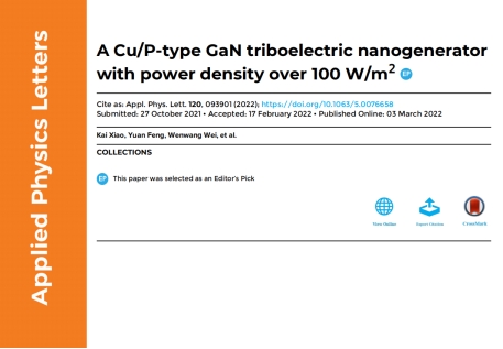 近日,物理科学与工程技术学院孙文红团队在Nature Index著名学术期刊《Applied Physics Letters》上发表了题为“A Cu/P-type GaN triboelectric nanogenerator with power density over 100 W/m2”的研究论文。该论文被编辑选为“Editor's Pick”文章,在APL官网首页加以重点展示(Editor's Picks serve to highlight articles with excellent scientific quality and are representative of the work taking place in a specific field)。