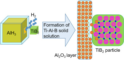 AlH3是一种亚稳态氢化物,储氢密度高达10.1 wt%,可在150–200 °C的低温下释放氢气。通过球磨引入添加剂(例如NbF5、TiF3等)可以显著降低AlH3的分解温度,但通常也会同时降低可用氢容量。针对这一问题,我院新能源材料团队刘海镇副教授与合作者通过调控球磨工艺参数以及引入TiB2改善了AlH3的放氢性能。在225 rpm转速下球磨108 min的AlH3 + 2.5 wt% TiB2具有最佳的放氢性能,其起始放氢温度为78 °C,比单纯AlH3低60 °C,放氢在130 °C终止,可获得8.5 wt%的氢气。此外,在80 °C的恒定温度下,在200 min内可放出5.3 wt%的氢气,而在相同条件下,单纯的AlH3几乎不能释放任何氢气。用Kissinger方法计算的AlH3 + 2.5 wt% TiB2的放氢反应活化能为86 kJ mol−1,比单纯AlH3低28 kJ mol−1。催化机理研究表明,AlH3表面的Al2O3层会与TiB2相互作用,形成Al–Ti–B固溶体,导致晶格畸变,使得晶格活化,从而改善AlH3的放氢动力学。这项工作为实现亚稳态AlH3的高容量和低温放氢提供了一种有效的策略。