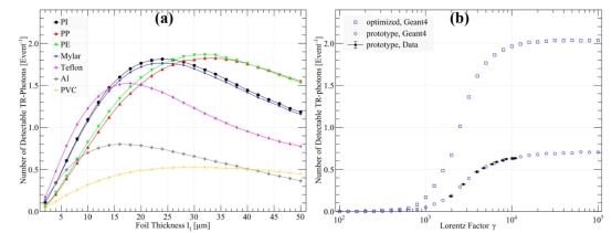 图(a)不同材料辐射的可探测TR光子数量与箔厚度的关系;