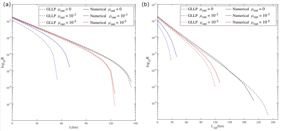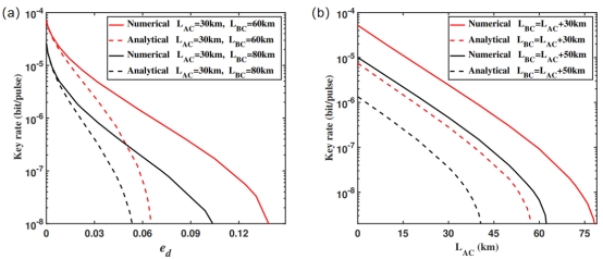 图4:(a)非对称MDI-QKD系统错误率ed 与密钥率关系的仿真结果;(b)系统错误率ed =0.087时,MDI-QKD各种非对称情况的密钥率仿真结果。实线是该研究的方法(Numerical)的密钥率仿真结果,虚线是传统的分析方法(Analytical)。