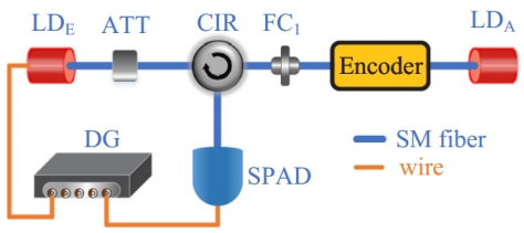 图1 :实验测试编码模块反射率所用时域反射装置示意图。Encoder:被测编码模块。LDE,窃听者Eve的激光器;LDA,编码端Alice的激光器;ATT,光衰减器;FC1:FC/APC型光纤连接器;CIR:环形器;SPAD:门控红外单光子雪崩探测器;DG:数字延时发生器;SM fiber:单模光纤。