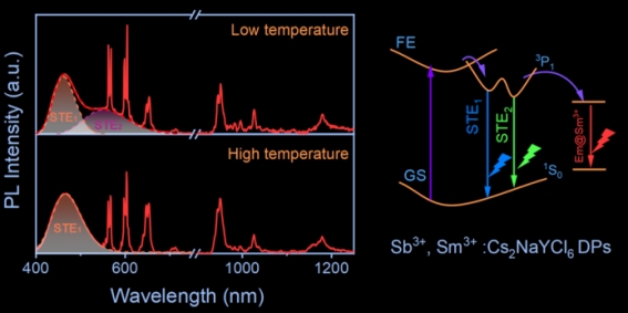 研究采用溶剂热法合成了Sb3+, Sm3+共掺杂Cs2NaYCl6稀土基双钙钛矿,可以通过调节带隙结构和能量传递的通道来有效地调节发光。随着Sm3+离子掺杂浓度的增加,由于自陷激子(STE)到Sm3+离子的有效能量转移,可以将发射从蓝光调节到白光。变温光致发光光谱表明,低温下产生了双STE发射,这归因于Jahn-Teller效应导致3P1激发态产生两个极小值。光学温度传感器的相对灵敏度达到1.08 % K-1,优于其他稀土钙钛矿。基于Sb3+, Sm3+共掺杂Cs2NaYCl6@聚甲基丙烯酸甲酯(PMMA)的LED器件的色度坐标为(0.29, 0.28),显色指数为87,相关色温为10986 K。这项工作为调控能量转移提供了新的物理见解,并为功能材料的合理设计提供了参考。