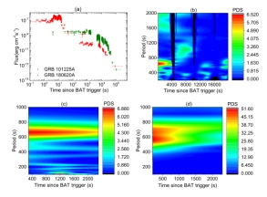 图一 GRB 180620A的光变曲线和时频分析揭示的准周期信号