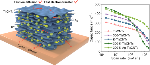 针对以上出现的问题,结合已有理论。我院新能源团队通过对Ti3CNTx基电极材料进行钾离子插层及表面改性,并进一步在Ti3CNTx层间引入银纳米线,得到了兼具高比电容和高倍率性能的300-K-Ag-Ti3CNTx电极材料。300-K-Ag-Ti3CNTx电化学性能的提高可归因于Ti3CNTx层间距的增加和表面官能团浓度的降低以及高导电性。实验结果表明,在纳米片之间插入阳离子并降低官能团浓度可以显著提高Ti3CNTx的质量比电容,在引入K+并去除官能团(-OH,-F)后,质量比电容大幅提高到464 F g-1。Ti3CNTx 基薄膜的电导率受层间阳离子和表面官能团的影响。300-K-Ag-Ti3CNTx薄膜的电导率增加到1030.93 S cm-1,并显示出优异的倍率性能,即使在2000 mV s-1下,其质量比电容也可以保持在245 F g-1。表现出优异的倍率性能。基于300-K-Ag-Ti3CNTx薄膜的全固态对称超级电容器在350 m W g-1时显示出6.9 mWh g-1的高能量密度,表明它们在柔性储能装置方面有很大的应用潜力。这项工作将进一步推动柔性MXenes基电极的研究;特别是Ti3CNTx基电极,在超级电容器和可穿戴电子设备领域具有广阔的应用前景。