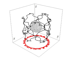 右:试验粒子在科尔-纽曼黑洞周围的轨迹示意图(黑色),红色为轨迹在xoy面的投影,灰色为黑洞的视界面。