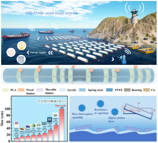 摩擦纳米发电机(TENG)可有效采集高熵低频波浪能,但传统厘米-分米级别尺寸的TENG难以契合现实海洋环境下米级别尺寸的波长,从而影响其波浪能转换效率。近日,广西大学蓝色能源团队提出并设计了一种米级别的大尺寸摩擦纳米发电机(OM-TENG)。该发电机的尺寸首次达到了一米级别,设计和优化了包括灯笼形叠层TENG单元、滑动模块以及限位器等创新结构,通过这些巧妙设计解决了器件尺寸扩大所带来的一系列问题,并提高其在强风浪环境下的稳定性,从而显著提高了TENG的输出功率。是TENG单周期转移电荷量达到60.82 μC以及摩擦层面积密度达到1.76 cm−1。并且从理论分析、多物理场数值模拟、传感器数据统计、对照组实验测量等方面都证明了,OM-TENG比小尺寸TENG可更好地捕获实际环境下米级别尺寸的波浪,并具备优良的抗倾覆能力。实验上,OM-TENG的摆动倾角、摆动频率、匹配阻抗、定轴旋转角以及运动方向等被深入探究,从而其输出性能得到优化提升,其输出电压和电流最高分别可达584V和444μA,可点亮96个2W功率的小灯泡,并成功驱动无线温湿度计以及商用射频模块,实现了无线信号传输。这项工作印证了OM-TENG作为大尺寸器件在采集实际波浪能上的优势,并为后续大尺寸TENG的设计和制备提供了参考范例。