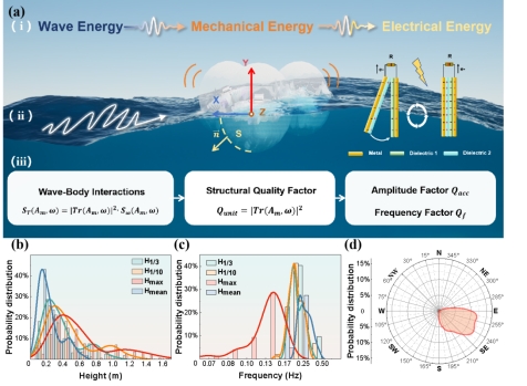 现阶段波浪能和TENG壳体机械能之间的能量转换关系还未有系统的研究。这导致基于现有评价因子设计的TENG在海浪环境中发电单元的摩擦层或接触层难以按照理想状态展开,导致器件可靠性差和电能转换效率低且不稳定的问题。另一方面,评判TENG器件波物耦合适配程度的标准尚未完善。这导致不同形状壳体间的波浪能吸收和转化能力难以比较。因此,有必要基于真实海浪的随机特性,从统计学和能量转化的角度提出量化评估壳体对波浪能吸收能力的结构品质因数。这对设计高效采集波浪能的TENG器件和内部采能方向的选择具有重要意义。为了解决上述问题,本文引入随机波浪理论和谱分析法,从统计学和能量转化的角度出发提出了用于定量评估海上漂浮式摩擦纳米发电机(Flo-TENG)壳体及其对波浪能吸收转化能力的结构品质因数(Qunit)。并根据海浪周期和波高的作用特性将其分为振幅结构品质因数(Qacc)以及频率结构品质因数(Qf)。此外,本文还系统性地研究了各个壳体参数对Qunit的影响。通过一系列的研究发现:波浪作用在器件的不同轴向上产生了不同的能量吸收和转化行为,即壳体对能量的吸收和转化具有轴向性;正方形器件的能量吸收主要来自Z向的贡献,四棱台、圆台和半球型器件的能量吸收主要来自三个轴向的共同贡献等。该成果以“Structural Quality Factor of Flo-TENG under Stochastic Wave Excitation”为题发表在学术期刊《Advanced Science》(IF=14.3)上,广西大学为第一通讯单位。