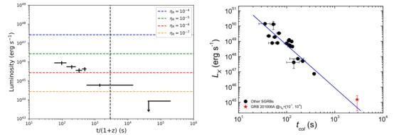 图4. 左图:不同辐射效率ηR下推断出的X射线平台光度,黑色虚线表示射电闪的爆发时间(静止坐标系)。右图:具有内部平台的短伽玛暴的LX−tcol反相关关系。