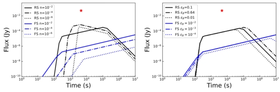 图2. GRB 201006A在144MHz射电波段的FS和RS余辉光曲线。红色的五角星代表观测到的相干射电闪,其峰值流量密度为49 ± 27 mJy,红移为0.58 ± 0.06。
