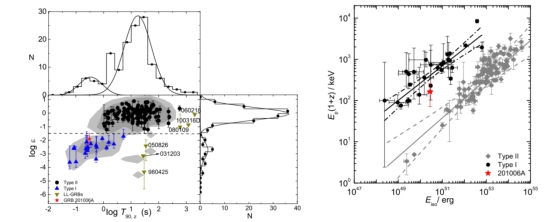 图1. 左图:GRB样本在T90−ε空间的1D和2D分布。右图:Ep−Eγ,iso相关性。