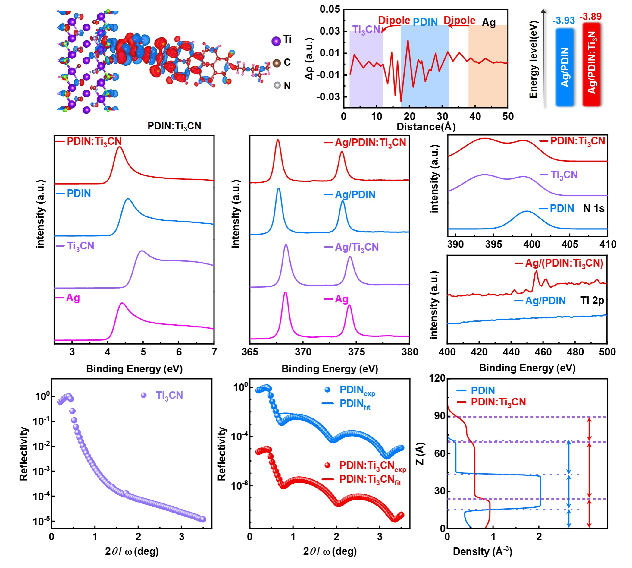 针对以上问题,我院薄膜光伏团队联合四川大学和淮北师范大学采用混合阴极界面层策略(将具有高光学透明度和优异导电性的MXenes二维材料Ti₃CN,修饰PDI及其衍生物)调控PDI分子的聚集行为,揭示Ti₃CN与PDI界面层的N-N耦合作用机制。当在PDIN中引入1 wt%的Ti₃CN时,Ti₃CN表面钛原子通过电子转移与含有氨基的PDIN形成定向偶极结构。N-N相互作用下Ti₃CN:PDIN混合阴极界面层有更合适的能级匹配,增强导电性,从而提升电荷提取性能。此外,Ti₃CN的引入有效调控了PDIN薄膜的垂直相分布,使PDIN更加致密有序,降低陷阱态密度,形成更光滑的表面,从而构建高效的电子传输路径,显著增加了阴极界面层的膜厚耐受性。将该界面层应用于PM6:BTP-eC9和PM6/L8-BO有机太阳能电池器件时,分别实现了20.0%和19.5%的PCE,器件稳定性得到提升。本研究提出的N-N耦合策略为开发高效有机太阳能电池混合阴极界面层提供了新的见解。