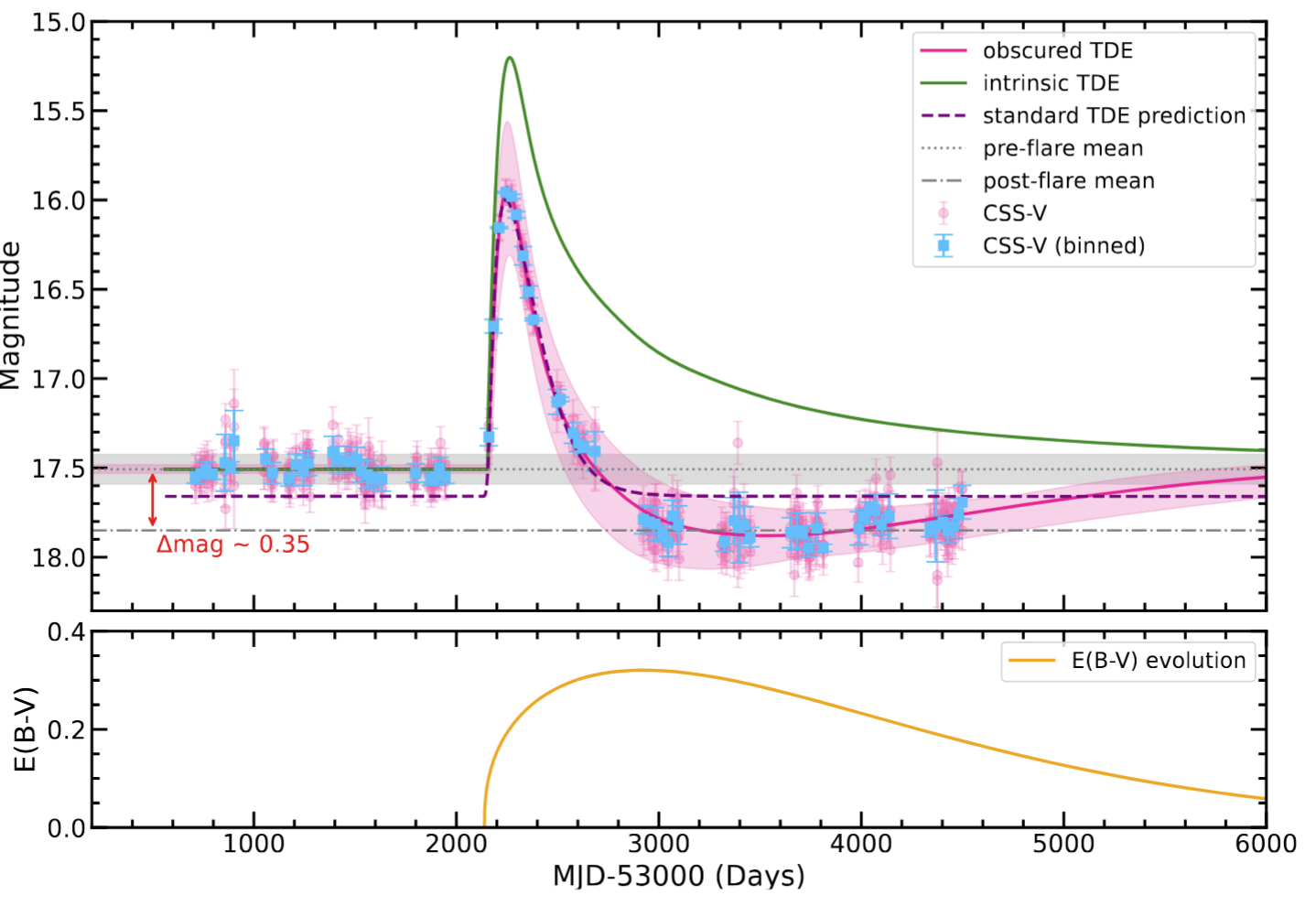 图一: 上图:粉色点表示单次曝光的 CSS V 波段原始数据。蓝色点为分bin后的数据。粉色实线为遮蔽 TDE 模型的最佳拟合结果,粉色阴影区域表示由模型参数不确定性确定的置信区间。作为对比,绿色实线表示去除遮蔽成分后恢复的本征 TDE 光变曲线,紫色虚线表示假设无遮蔽时常规理论 TDE 模型的预测。黑色虚线和灰色带分别表示爆发前星等的均值和标准差,灰色点划线表示爆发后星等的均值,比爆发前暗约 0.35 星等(红色箭头所示)。下图:遮蔽 TDE 模型最佳拟合参数所确定 E(B–V) 的时间演化。